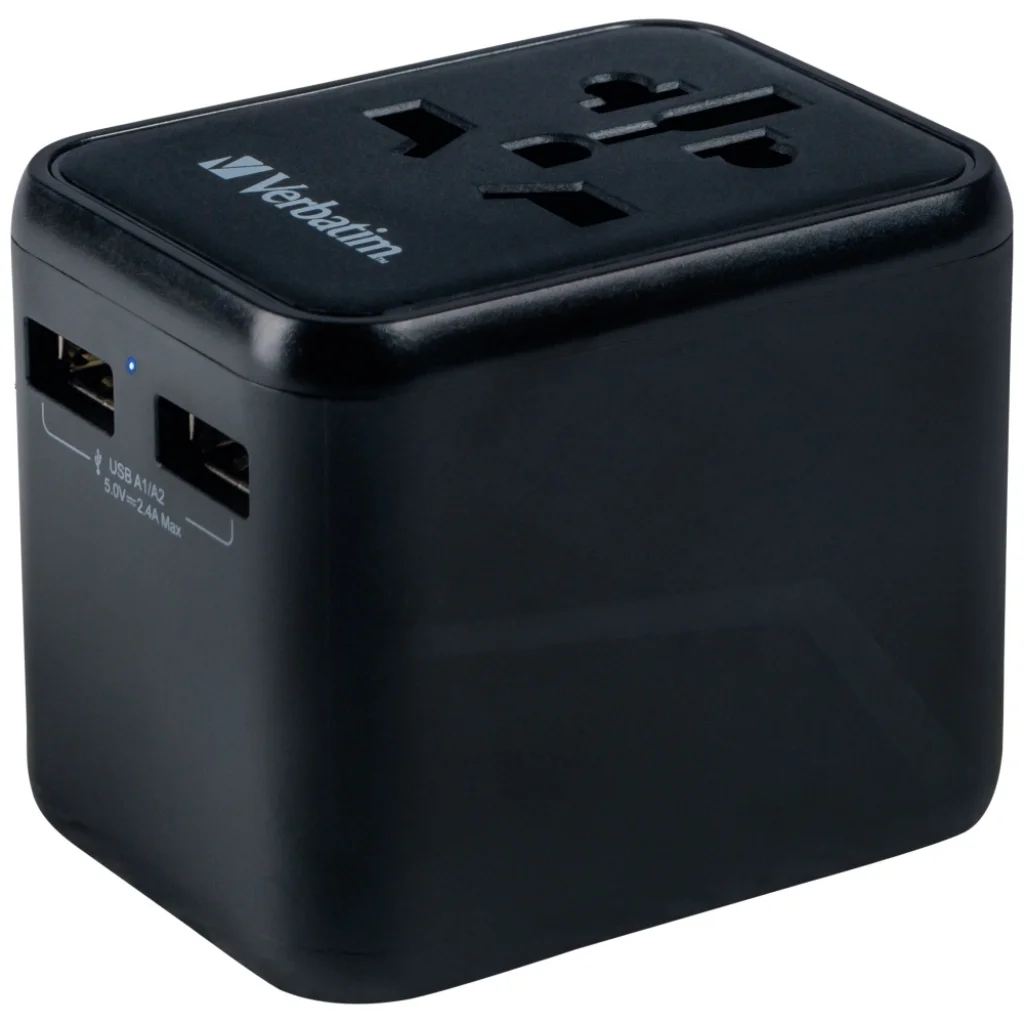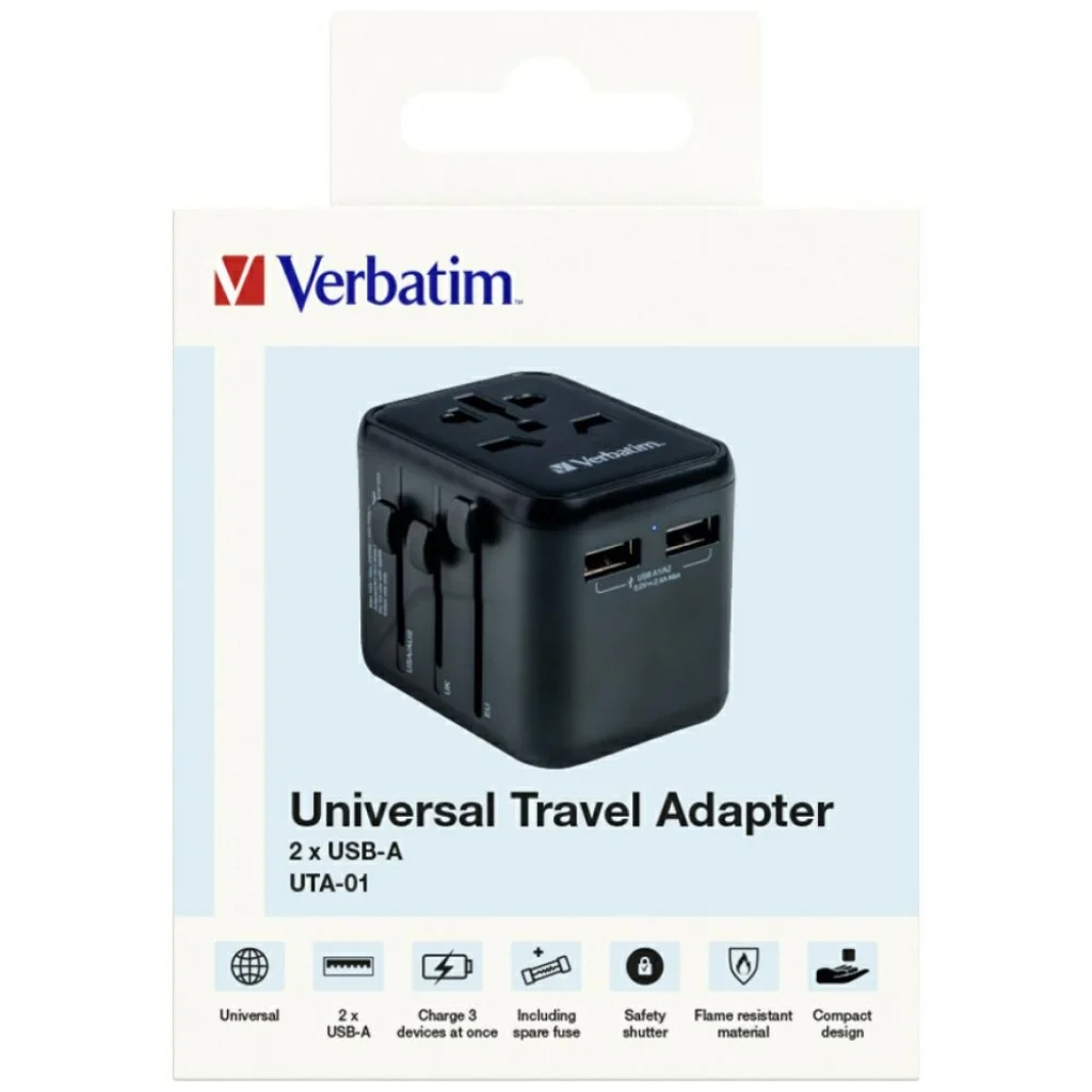 A Verbatim univerzális utazó adapter megbízható megoldás utazók számára, több mint 180 országban működik. Vigye magával, és soha ne aggódjon az áramellátás hiánya miatt. A globális adapter lehetővé teszi, hogy bármilyen helyi áramforráshoz csatlakoztassa a készülékeket szerte a világon. Az alján található két USB-A port lehetőséget nyújt minden USB-eszköz, köztük okostelefonok, Bluetooth hangszórók, táblagépek, hordozható akkumulátorok és e-könyv olvasók töltésére.
