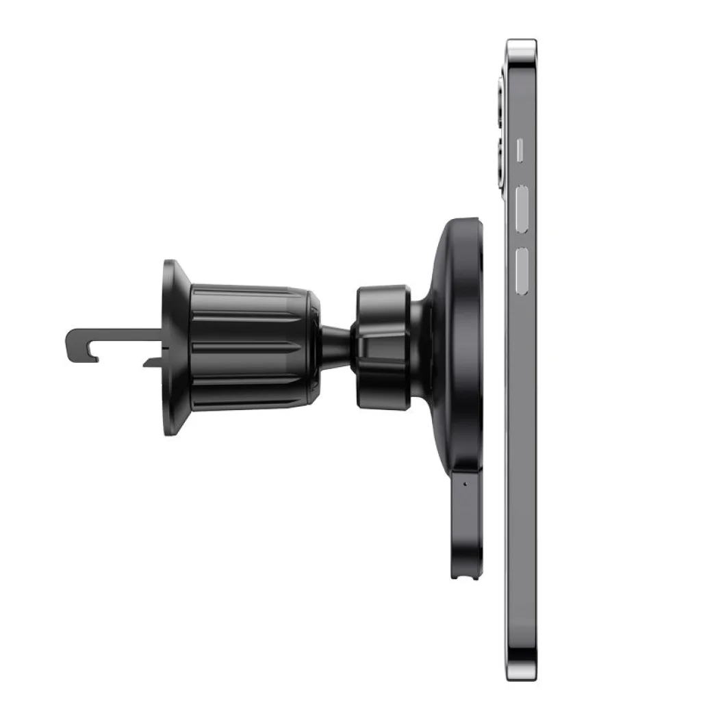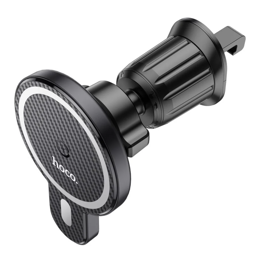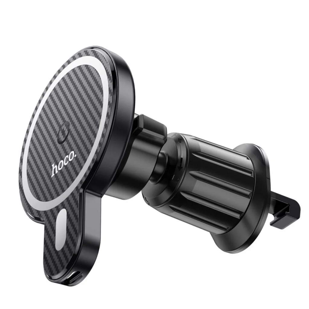Vezeték nélküli autós töltő Hoco CA85 - Fekete. A Hoco CA85 autós töltőt kifejezetten az iPhone 12 / 13 sorozathoz tervezték. A MagSafe rögzítőrendszer biztosítja a telefon szilárd rögzítését. Maximális töltési teljesítménye 15W. A külső dizájnja egyedülálló, szénszálat imitáló megjelenésű. Az autós tartó rögzítése ugyanolyan egyszerű, mint a telefon elhelyezése rajta.