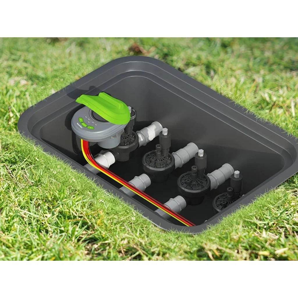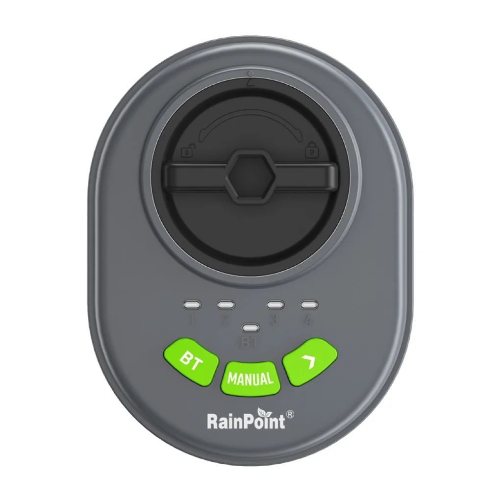 A RainPoint öntözésvezérlő az időjárás viszontagságainak is ellenáll. Az IP67-es besorolású vízálló ház garantálja, hogy a készülék még heves esőzés vagy poros környezet esetén is teljes mértékben működőképes marad. A készülék elegáns, ovális, szürke kialakítású (mint a mellékelt képeken látható), zöld "BT" és "MANUAL" gombokkal, valamint nyílbillentyűkkel és négy LED kijelzővel (zónánként egy-egy). Ezek a fizikai gombok és a letisztult LED-ek egyszerűvé teszik a kézi beállítást és az azonnali öntözés indítását, szükség esetén akár az alkalmazás nélkül is. A készülék könnyedén elhelyezhető egy szelepdobozban, mint ahogyan a mellékelt képeken is bemutatásra került, vizuálisan is illeszkedve a kerti környezetbe.