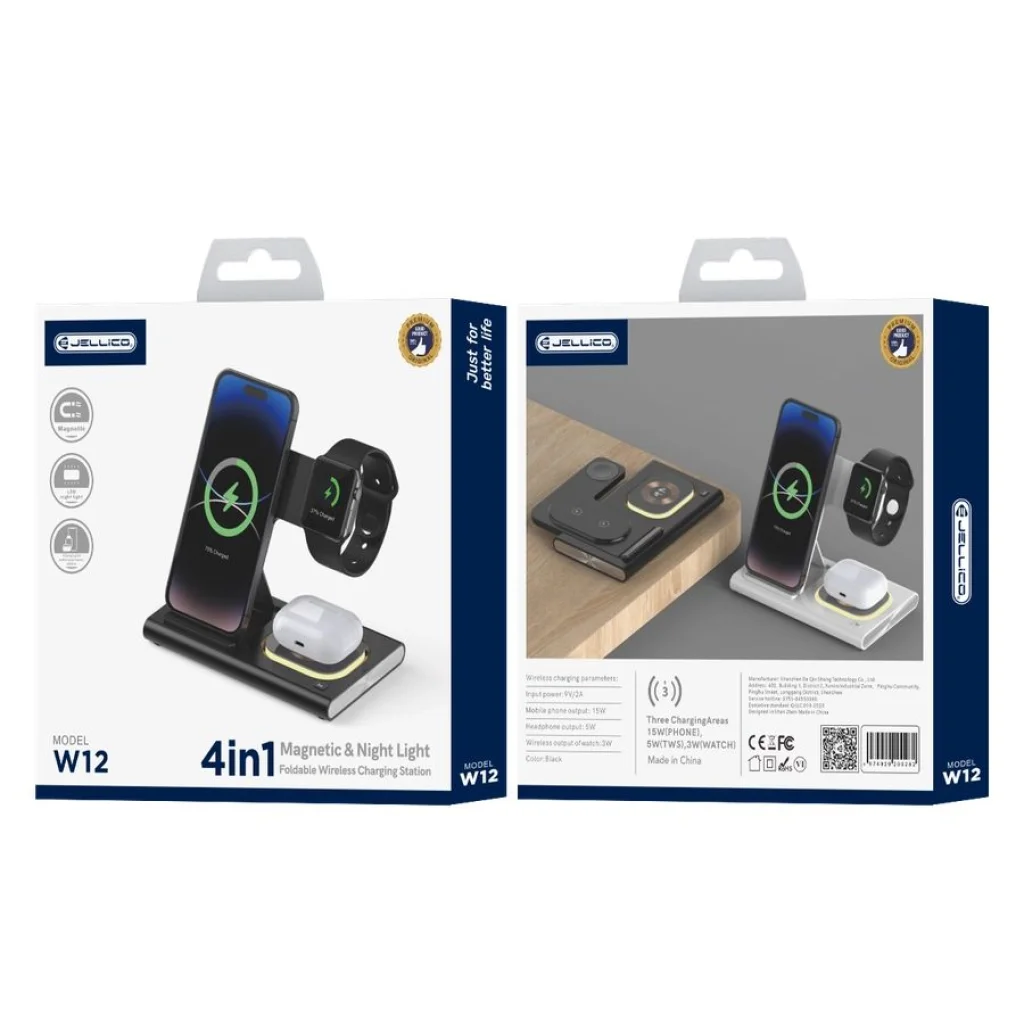 • Univerzális kompatibilitás: Ne aggódj a márkák miatt! A JELLICO W12 vezeték nélküli töltés támogatja a vezeték nélküli töltésre alkalmas Apple és Android telefonokat, valamint az összes Apple Watch sorozatot. Egyszerűen helyezd rá eszközeidet, és hagyd, hogy a töltő tegye a dolgát.