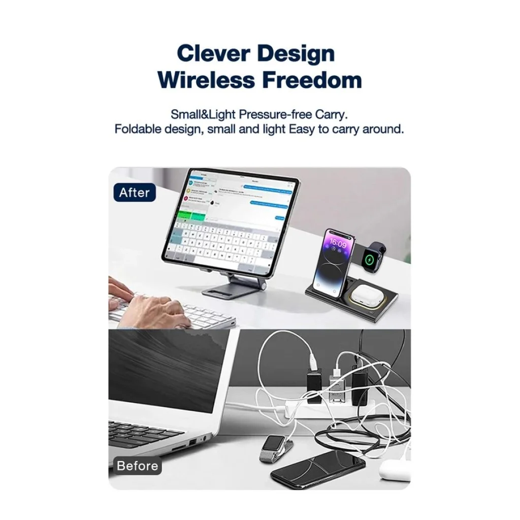 • 4 az 1-ben multifunkció: Tölts egyszerre három eszközt – telefonodat, vezeték nélküli fülhallgatódat és Apple Watch okosórádat – miközben élvezheted a beépített éjjeli lámpa kényelmét. Mondj búcsút a zsúfolt konnektoroknak és a kábeldzsungelnek!