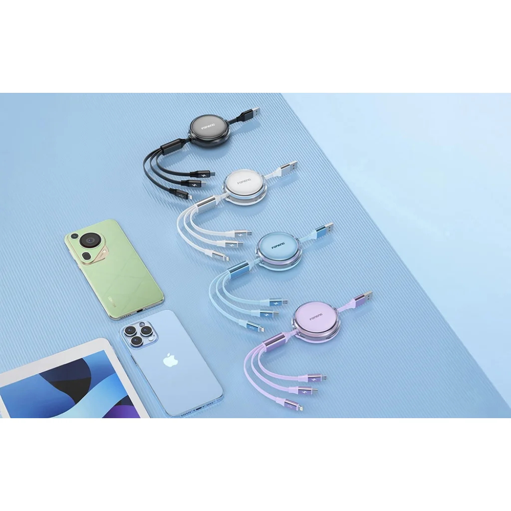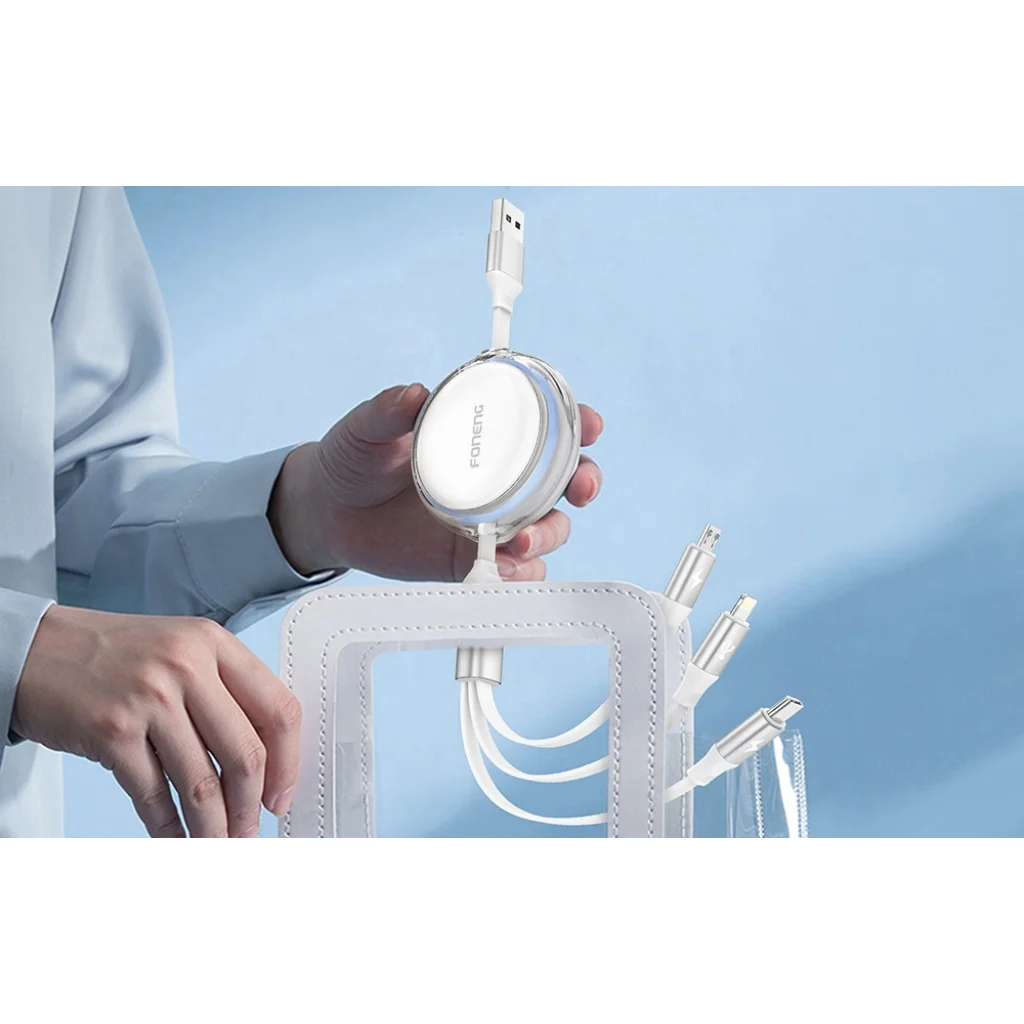 A Foneng X113 kábel teleszkópos, kétfokozatú kialakítással rendelkezik, amely kényelmes skálázást biztosít mindkét irányban. Ez lehetővé teszi, hogy a kábelt az Ön igényei szerint állítsa be, optimális hosszúságot és kényelmet biztosítva. Támogatja három különböző interfésszel rendelkező készülékek töltését: Micro (2,1A), Lightning (2,4A) és Type-C (3A), adatátvitelt is biztosítva, így ideális azok számára, akik sebességet és funkcionalitást keresnek egyben.
