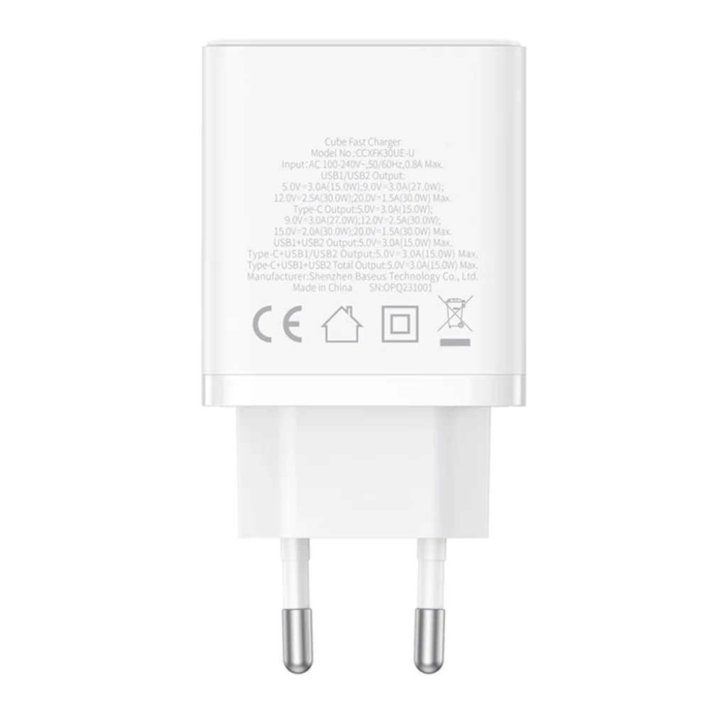 Ne kössön kompromisszumot a portok számában! A Baseus 30W falitöltő egy Type-C és két USB-A porttal rendelkezik, így egyszerre akár három eszközt is tölthet. Fontos megjegyezni, hogy bár egyetlen porton keresztül akár 30W teljesítményt is leadhat (például egy modern okostelefon vagy kisebb laptop gyors töltéséhez), több eszköz egyidejű töltése esetén az intelligens BPS 2.0 (Baseus Power Split) rendszer optimalizálja az energiaelosztást. Az összesített maximális kimeneti teljesítmény ilyenkor 15W.