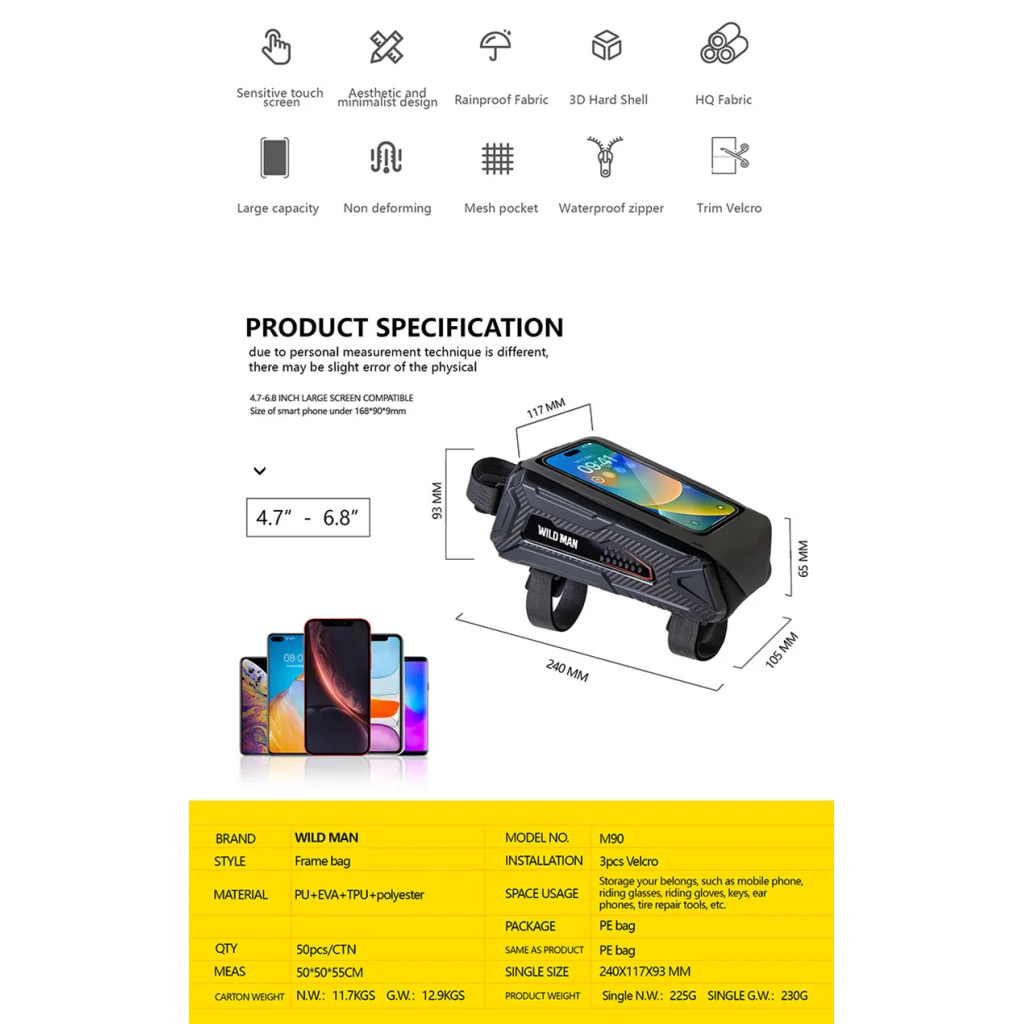 - Funkcionális vízálló biciklis váztáska beépített telefontokkal.