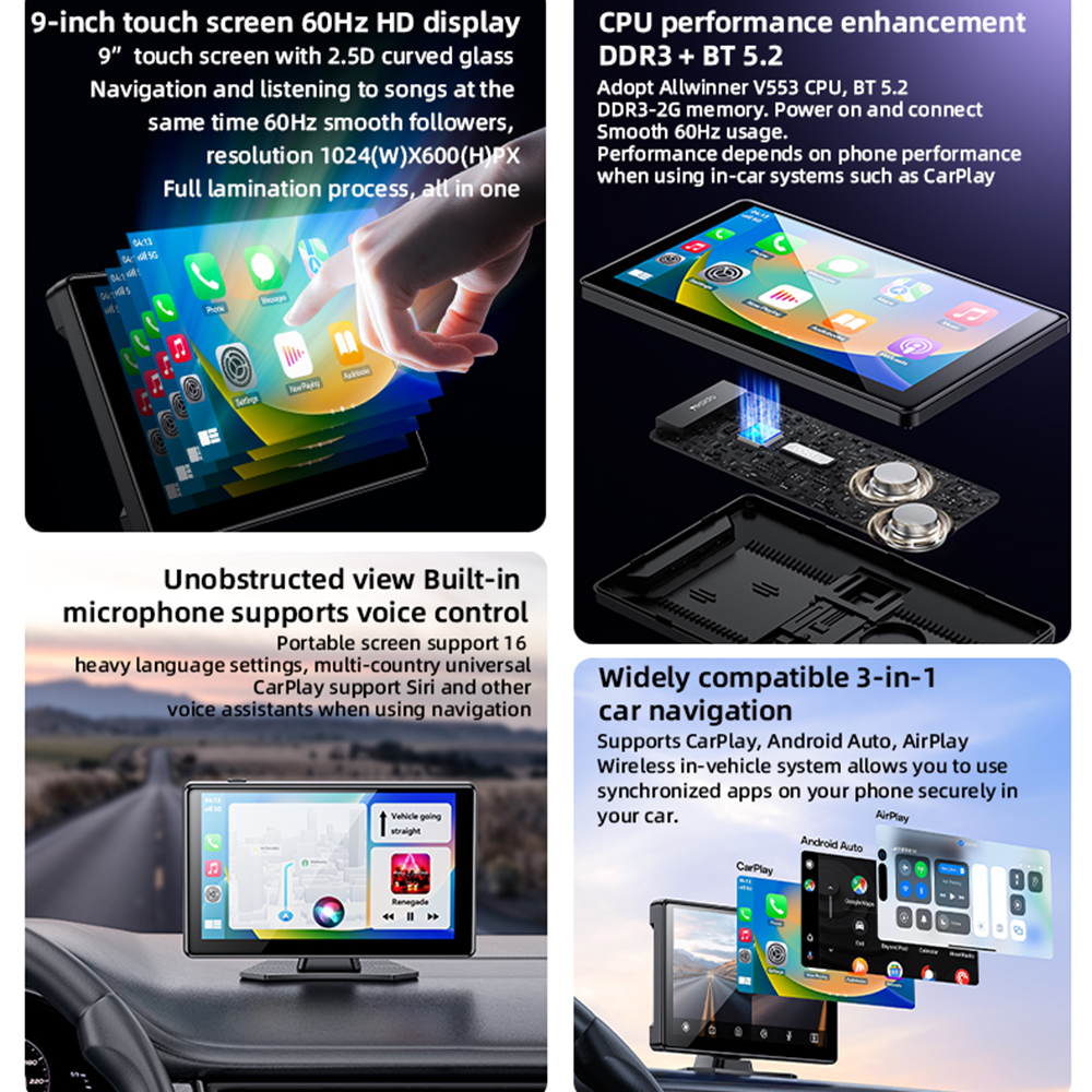 A Yesido autós sztereó rendszer lelke egy élénk, 9 hüvelykes, 1024x600 felbontású HD érintőképernyő, amely 60Hz-es frissítési frekvenciával biztosítja a sima és reszponzív működést. A teljes laminált képernyő modern megjelenést kölcsönöz, miközben az Allwinner V553 CPU és a 2GB DDR3 memória gondoskodik a gyors és akadozásmentes futásról, legyen szó navigációról, zenehallgatásról vagy videólejátszásról. A készülék bekapcsolása azonnali, így pillanatok alatt használatba vehető.