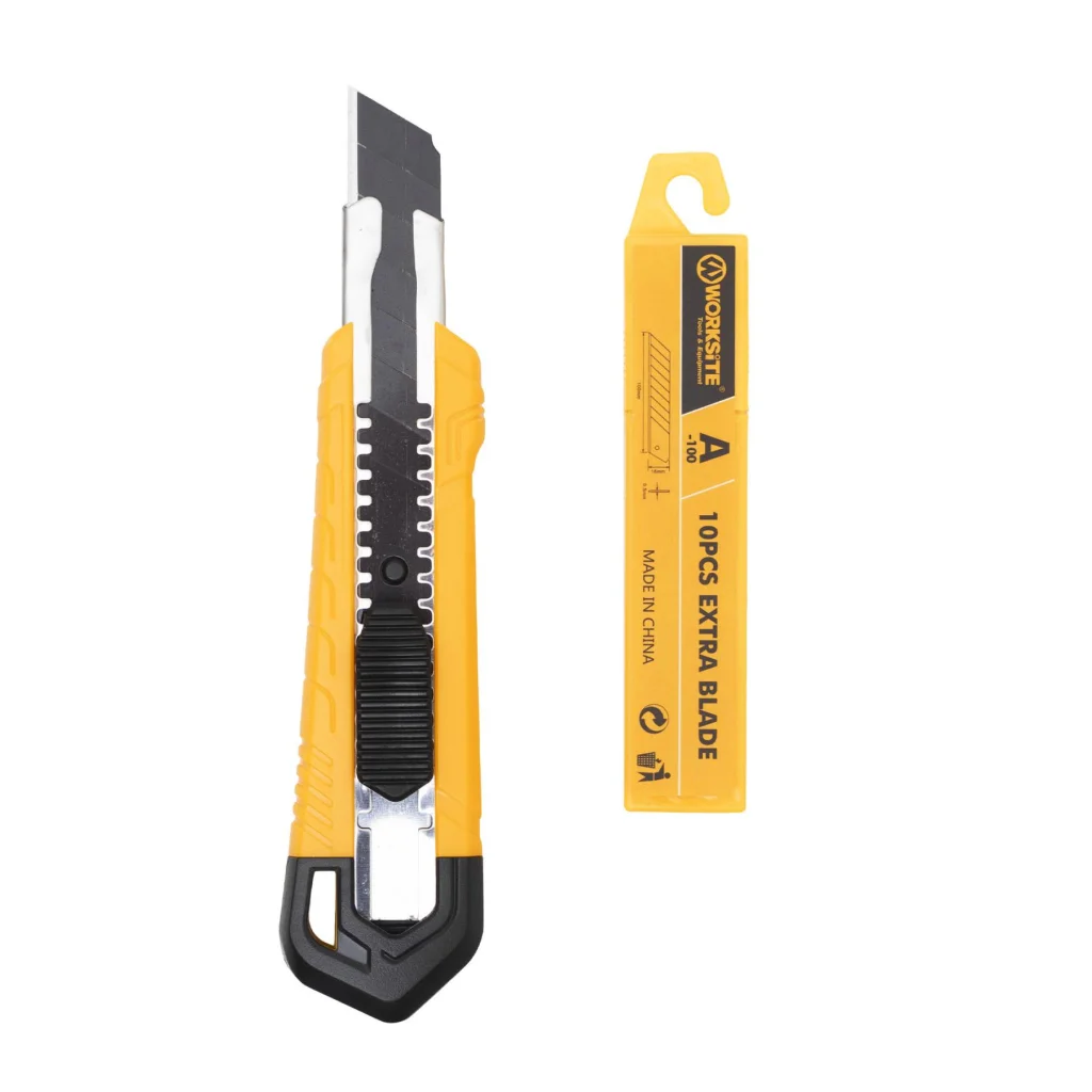 A WORKSITE WT6079 szike készlet a precíz és kényelmes vágás tökéletes eszköze. Az erős fém pengevezetővel ellátott kés 18 mm széles letörhető pengével rendelkezik, így mindig éles vágóél áll rendelkezésre. A csúszásmentes markolat és az ergonomikus kialakítás biztosítja a biztonságos és kényelmes használatot.