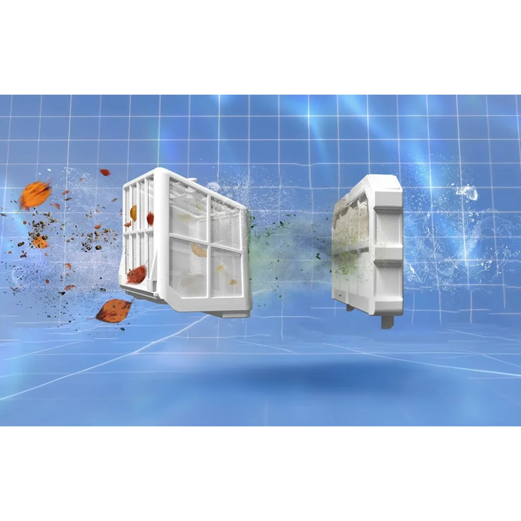 Az alkalmazott 3D Adszorpciós rendszer egy 180 μm-es precíziós szűrőkosarat kombinál egy ultrafinom, 40 ppi-s szivaccsal. A kétszintű szűrés hatékonyan fogja fel a különböző méretű szennyeződéseket, a finom portól és homoktól kezdve a levelekig, hajszálakig vagy kövekig. Ezáltal a víz tökéletesen tiszta és tiszta marad.