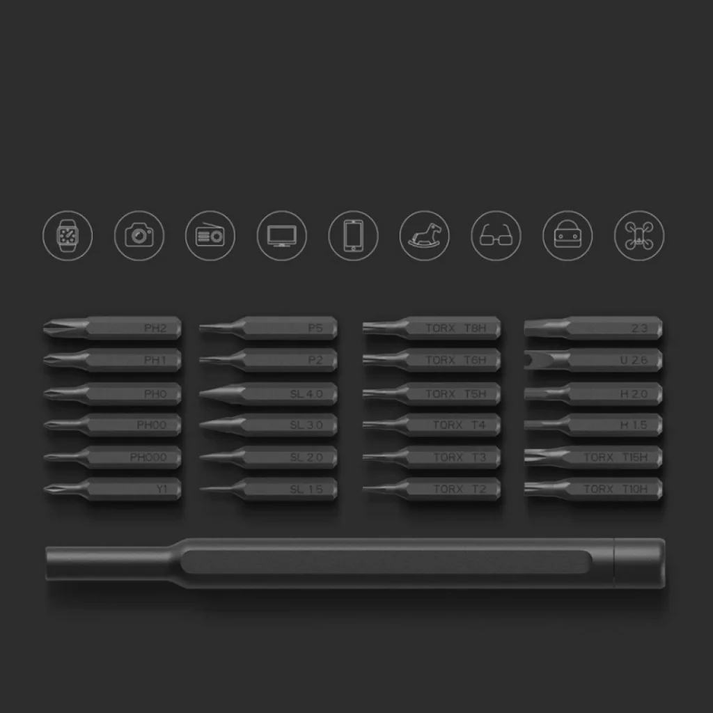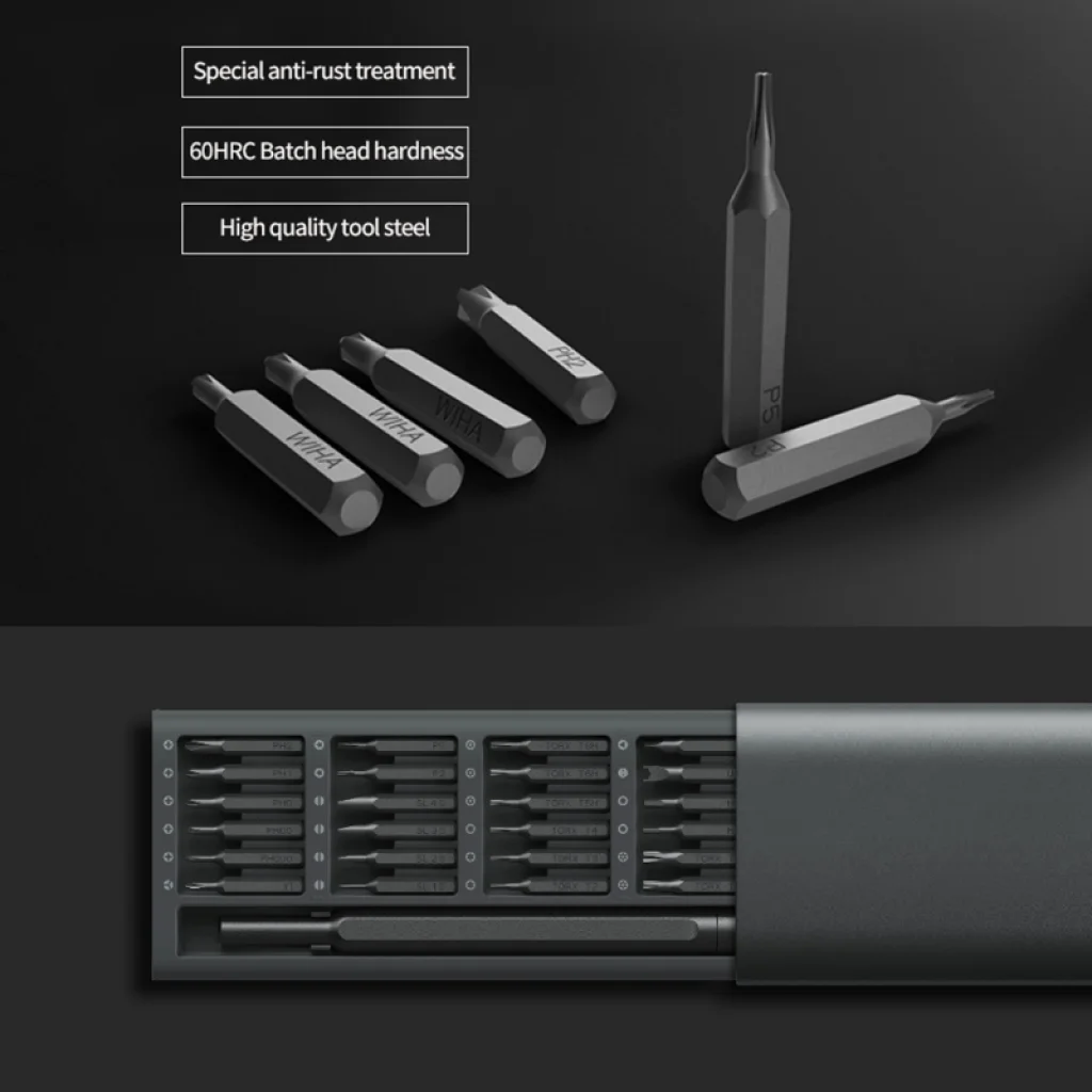 Xiaomi Mijia csavarhúzó 24 az 1-ben többmágneses csavarhúzókészlet 24 precíziós csavarhúzó bittel, összesen 9 típus, különféle modellek, amelyek alkalmazkodnak a különböző mindennapi használathoz. Kifinomult dizájn: Rozsdamentes alumíniumötvözet csavarhúzó markolat, sima ívelt él a kényelmes fogásért. Homokfúvott felületű anód kezelés, izzadás- és korrózióálló. Élvezetes élmény használat közben. Minden egyben: A legtöbb mindennapi javítási igényt kielégíti, alkalmas kvarcórákhoz, hétköznapi háztartási készülékekhez, például kamerákhoz, rádiókhoz, számítógépekhez, mobiltelefonokhoz, drónokhoz stb. Alumíniumötvözet nyél: A csavarhúzókészlet alumíniumötvözet markolatot tartalmaz speciális kezeléssel, forgatható sapka kialakítással, amely kényelmes használati élményt nyújt.