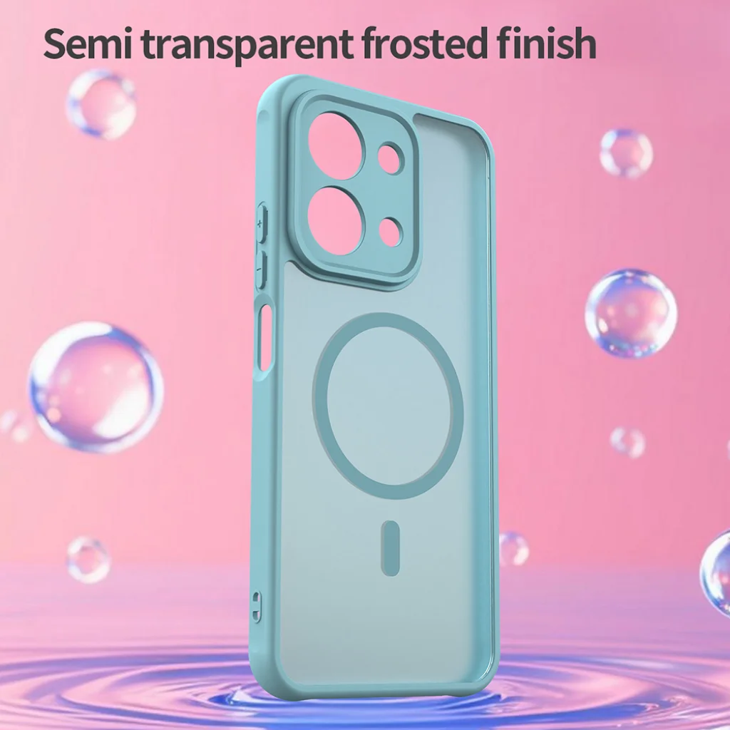 A halofrost ii tok integrált magsafe technológiával rendelkezik, amely lehetővé teszi a magsafe kiegészítők – mint például vezeték nélküli töltők vagy tartók – könnyű és biztonságos rögzítését. A félig átlátszó, matt (frosted) felületű hátlap elegáns megjelenést kölcsönöz, miközben diszkréten megmutatja telefonja eredeti designját. A mentazöld keret friss és modern kontrasztot ad.