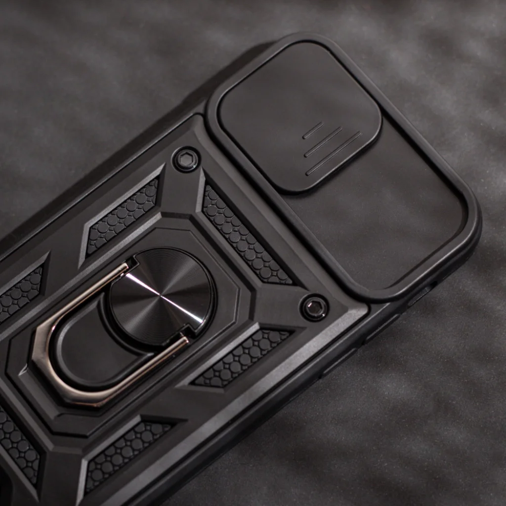 A beépített alumínium ujjmarkolat megkönnyíti a telefon tartását és állványként is szolgál. A mozgatható kamera fedél fokozza a magánélet védelmét és védelmet nyújt a lencséknek, míg a precíz vágások és gombok kényelmes használatot biztosítanak az eszköz számára.