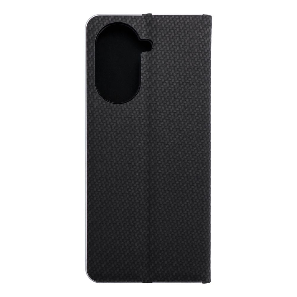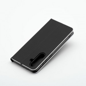 Elegáns tok fém kerettel a telefon fokozott védelméért. A vonzó textúra és a kellemes tapintású anyag stílusos tokot hoz létre, amely kihangsúlyozza a készülék modern dizájnját. A puha velúr anyag belül és a tartórészben mindkét oldalról védi a készüléket a sérülésektől és karcolásoktól. A fogantyú rugalmas szilikonból készült és kivágásokkal rendelkezik. Az alumínium keret a széleken erősebbé teszi a tokot és még jobban védi a készüléket. A fém és az eredeti anyag kombinálása egyedi és modern kompozíciót hoz létre, aminek köszönhetően a készülék stílusos és elegáns megjelenéssel bír. A tok egy kis zsebbel rendelkezik kényelmes dokumentumok vagy bankjegyek számára. A tok vízszintes alapot képez a filmek vagy fényképek nézéséhez. Egy erős mágnes biztosítja az egyszerű lezárást és nyitást, valamint megakadályozza a véletlen kinyílást.