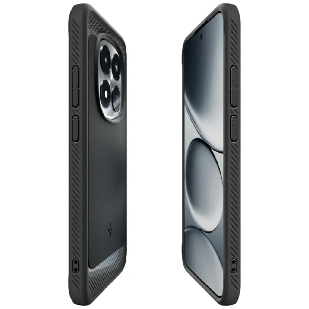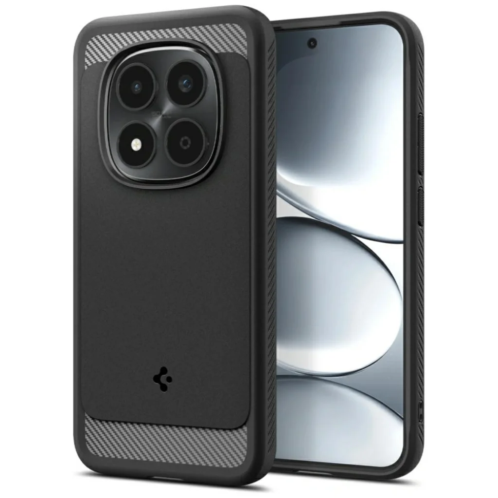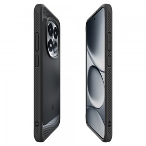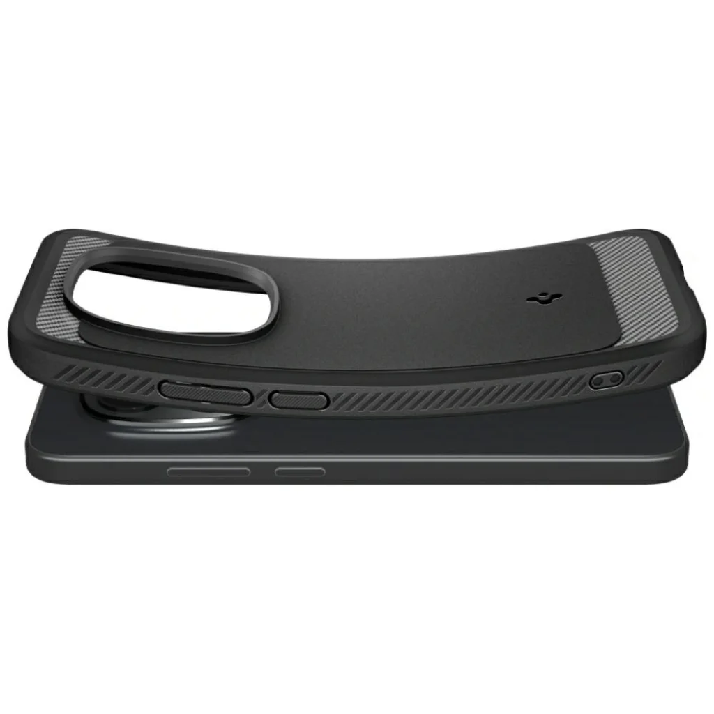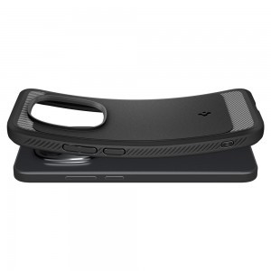 A Spigen Rugged Armor rugalmas tok modern megjelenésű karbon textúrával rendelkezik. Karcsú formája tökéletesen illeszkedik a telefonhoz, megőrizve annak eredeti sziluettjét. Az egész tok rugalmas TPU-ból készült, amely tartósságot és kiváló ütéscsillapítást biztosít. A belső Spider Web szerkezet hatékonyan oszlatja el az energiát esés során, minimalizálva a készülék sérülésének kockázatát. Az emelt szélek a képernyő és a kamera sziget körül védik a legérzékenyebb elemeket a karcolásoktól és a közvetlen talajjal való érintkezéstől. A precíz kivágások teljes hozzáférést biztosítanak az összes porthoz, gombhoz és hangszóróhoz. A texturált oldalak javítják a fogást, míg a szénszálas minta elegáns, technikai megjelenést kölcsönöz a toknak. A felhelyezés gyors és egyszerű – a telefont csak be kell helyezni a tokba, további eszközök használata nélkül.