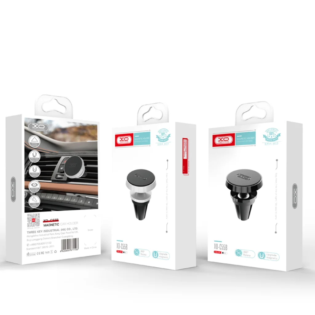 Az XO C55B egy univerzális mágneses tartó az autó szellőzőrácsához. Kis méreteinek köszönhetően bármilyen helyre tökéletesen illeszkedik. A készlet tartalmaz fém matricákat.