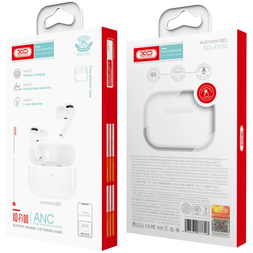 XO Design F100 Vezeték nélküli fülhallgató A F100 vezeték nélküli fülhallgató stabil kapcsolatot biztosít a Bluetooth v5.0 technológiának köszönhetően, és az Aktív zajszűrés (ANC) segít abban, hogy tiszta és érthető telefonbeszélgetéseket folytass. Specifikációk: