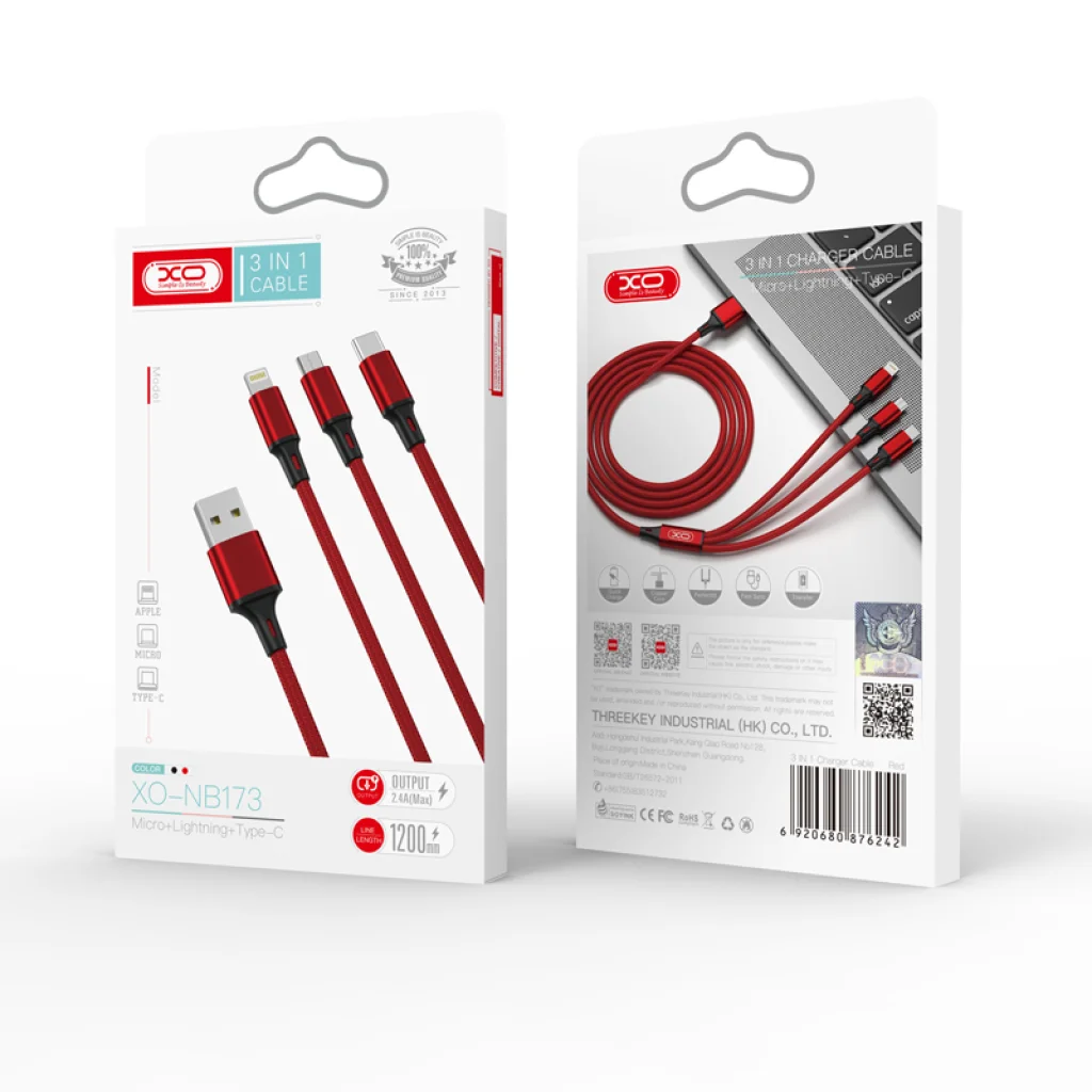 XO NB173 egy 3 az 1-ben kábel, amely három 8 tűs, micro és type-C csatlakozóval van felszerelve. A kábelt úgy tervezték, hogy a lehető legnagyobb kényelmet biztosítsa a mindennapi használat során. A nylon fonat garantálja a biztonságot a kábel használata során és hosszú élettartamát.