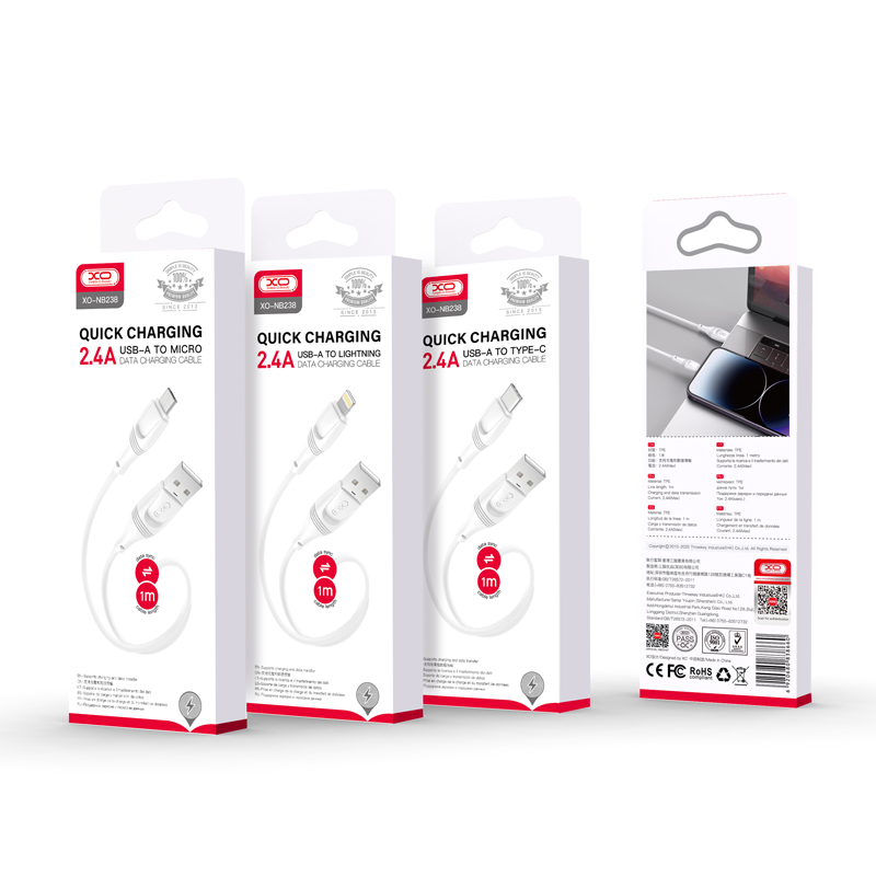 Az XO NB238 egy USB-C csatlakozóval ellátott kábel. A kábelt úgy tervezték, hogy a lehető legnagyobb kényelmet nyújtsa a mindennapi használat során. Rugalmas szilikonból készült, hogy a lehető leghosszabb élettartamot biztosítsa.