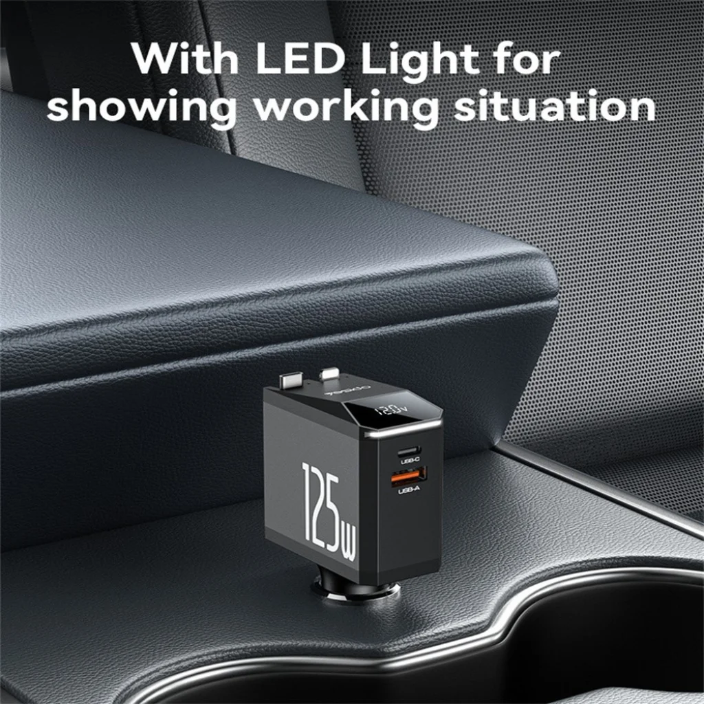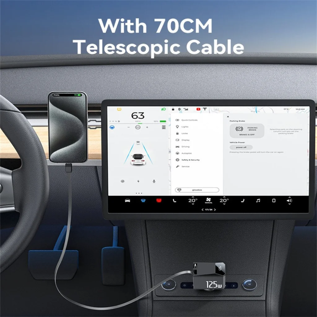- Beépített, visszahúzható Type-C kábel (Max. 65W): Ideális a legújabb okostelefonok, táblagépek és akár laptopok gyors töltésére. A 70 cm-es teleszkópos kábelnek köszönhetően könnyedén elérheti az utasok ülését vagy a műszerfalra helyezett eszközöket, rendet tartva az autóban.