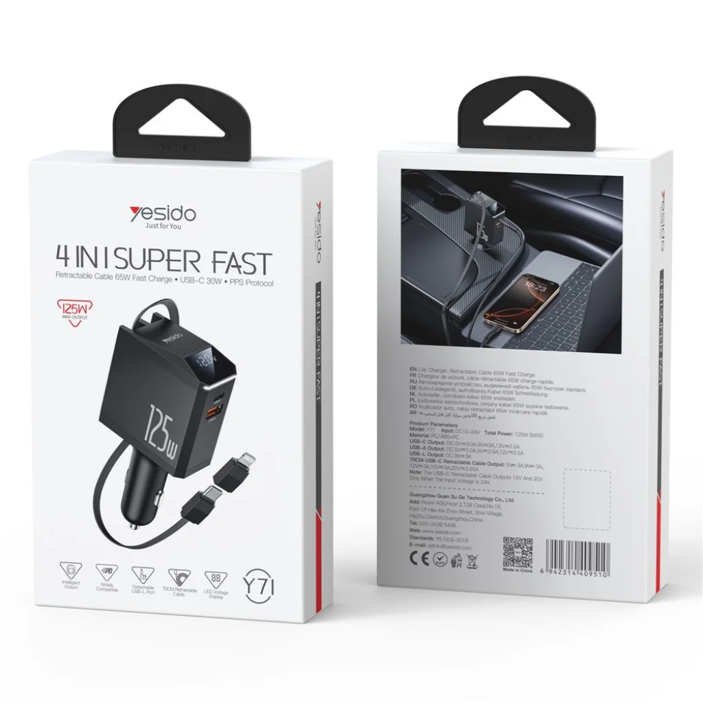 Fedezze fel a Yesido Y71 4 az 1-ben autós töltőt, amely minden igényét kielégíti, miközben úton van! Ez a sokoldalú és nagy teljesítményű töltő maximális rugalmasságot és hatékonyságot biztosít eszközei számára, legyen szó okostelefonról, táblagépről, AirPods-ról, vagy akár laptopról.