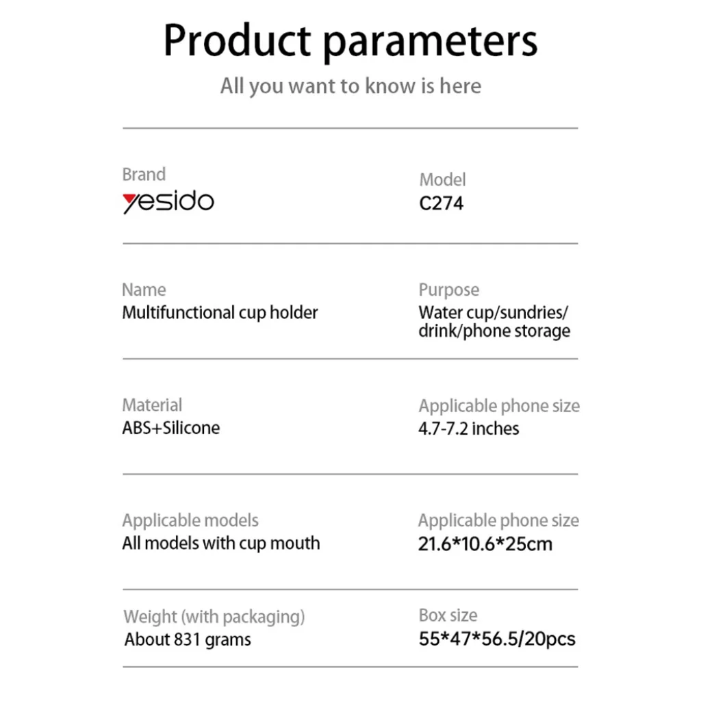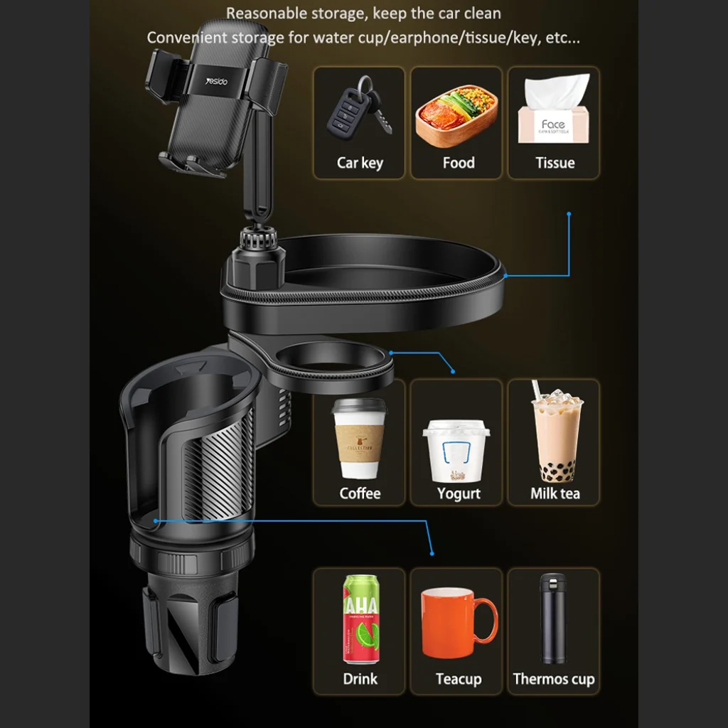 Tegye rendszerezetté és kényelmesebbé utazásait a Yesido Car Holder 4in1 (C274) multifunkcionális autós tartójával! Ez a forradalmi kiegészítő egyetlen elegáns megoldásban egyesíti a pohártartót, telefontartót, ételtálcát és apróságok tárolására szolgáló rekeszeket. Fekete színével és letisztult dizájnjával tökéletesen illeszkedik autója belső terébe, miközben maximális funkcionalitást nyújt.
