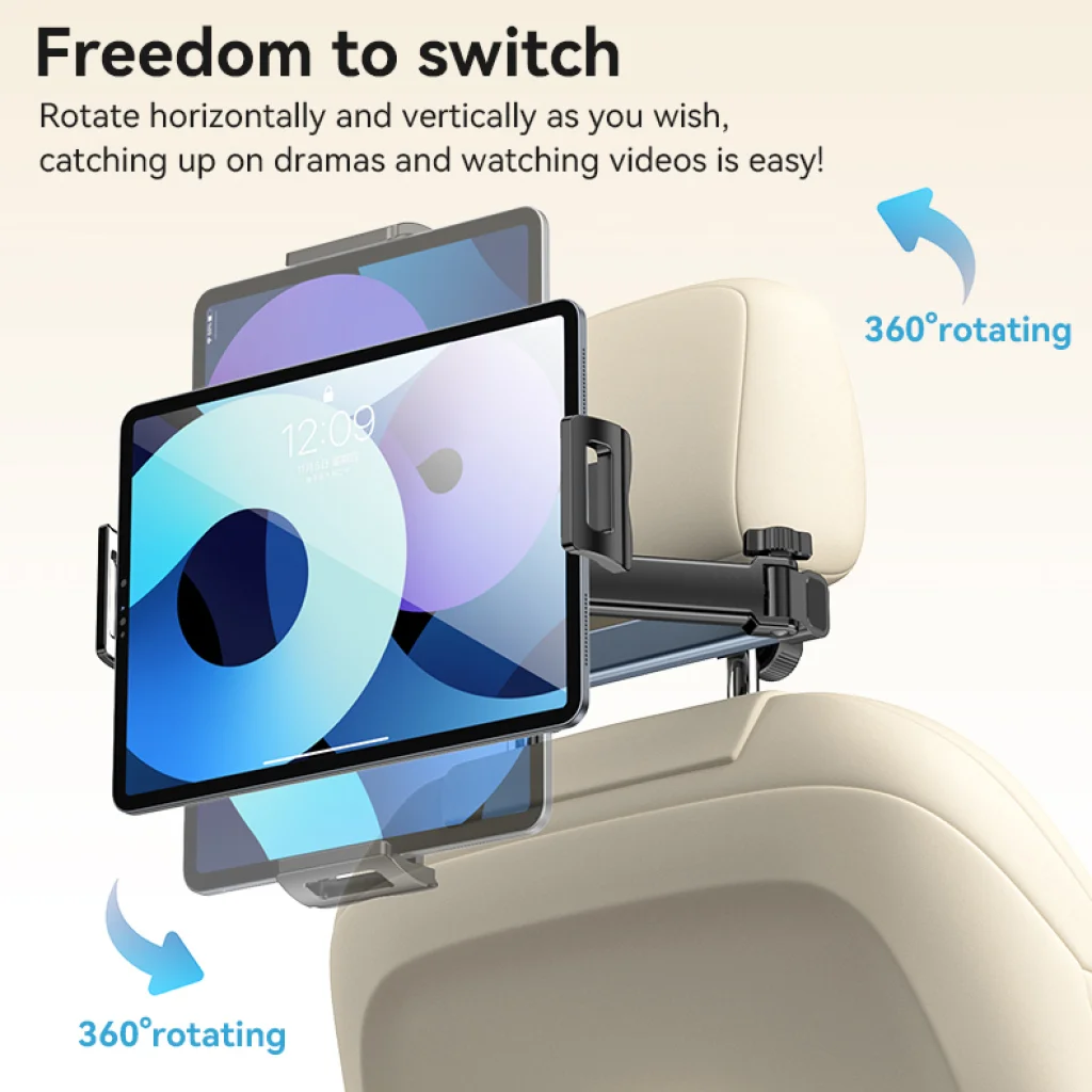 A szabadság a kezedben van! A 360°-ban forgatható tartó lehetővé teszi, hogy egyszerűen váltson a fekvő és álló tájolás között, így mindig a tartalomhoz és az utasok igényeihez igazíthatja a nézetet. A 60 mm-től egészen 270 mm-ig kihúzható teleszkópos karral és a visszahúzható rögzítőkarral a készüléket tökéletesen pozícionálhatja a közepén vagy közelebb az egyik utashoz, biztosítva a bal és jobb oldali nézetet is. Szabadítsa fel a kezeit, és élvezze a filmeket, videókat vagy drámákat!