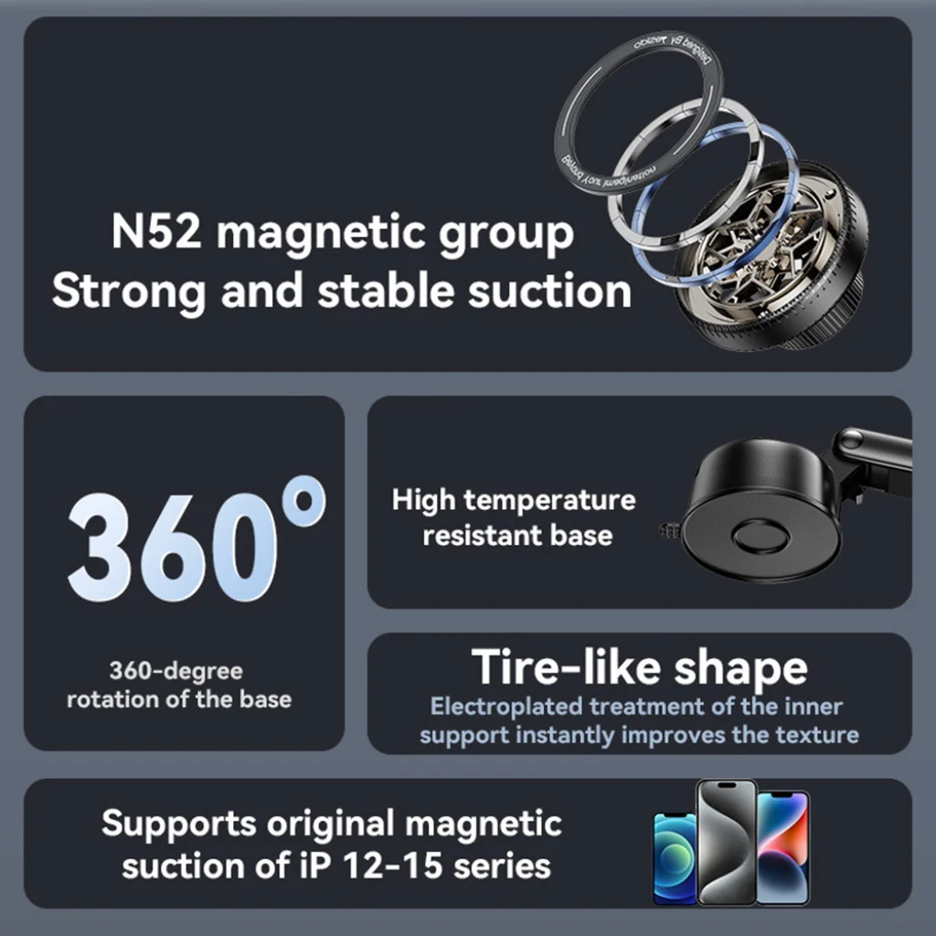A beépített N52 mágnesek rendkívül erősen és stabilan tartják telefonodat, garantálva, hogy a legrosszabb úton is a helyén maradjon. Kifejezetten támogatja az iPhone 12-15 széria eredeti mágneses rögzítését, de kompatibilis minden 4.7-7.2 hüvelykes telefonnal.