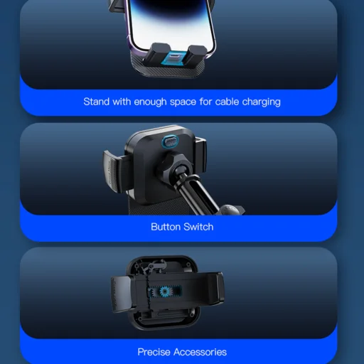 - Kényelmes töltési lehetőség: Az alsó támaszték kialakítása elegendő helyet biztosít a töltőkábel számára, így telefonját út közben is töltheti anélkül, hogy kivenné a tartóból.