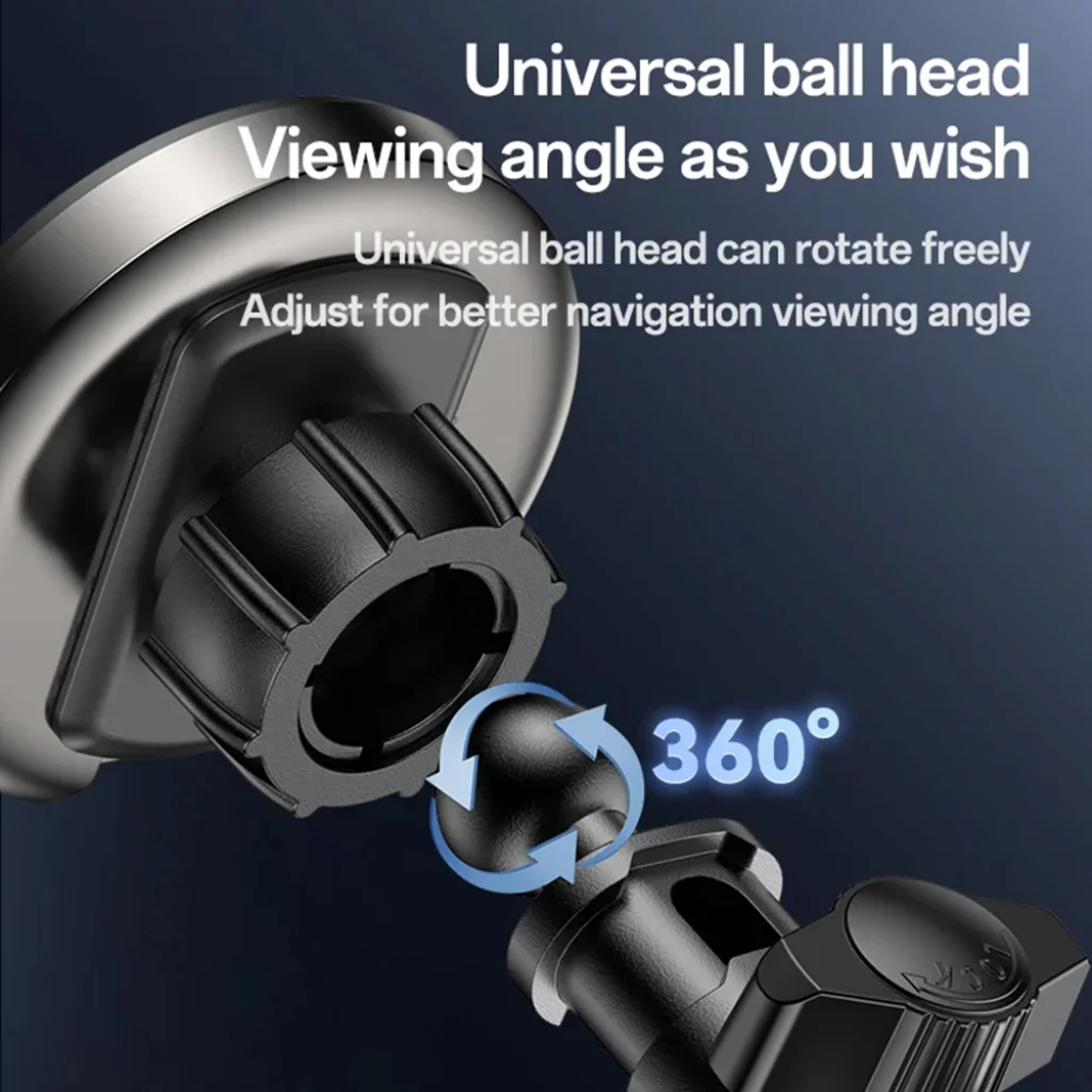 - Univerzális gömbcsukló: Az univerzális gömbcsuklónak köszönhetően a telefon tetszőlegesen elforgatható és 360°-ban állítható. Állítsa be az optimális látószöget a jobb navigáció érdekében, hogy minden információ tisztán látható legyen, és ne terelje el a figyelmét a vezetésről.