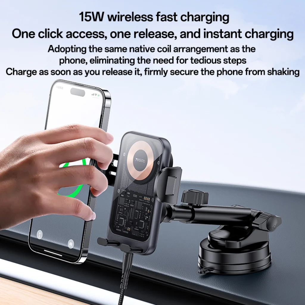 A Yesido C307 autós telefontartóval a modern technológia és a maximális kényelem találkozik, hogy utazásai még biztonságosabbak és élvezetesebbek legyenek. Ez a prémium minőségű, fekete színű tartó nem csupán stabilan rögzíti telefonját, hanem gyors, 15W-os indukciós töltést is biztosít, miközben elegáns, átlátszó dizájnjával emeli autója belső terét.