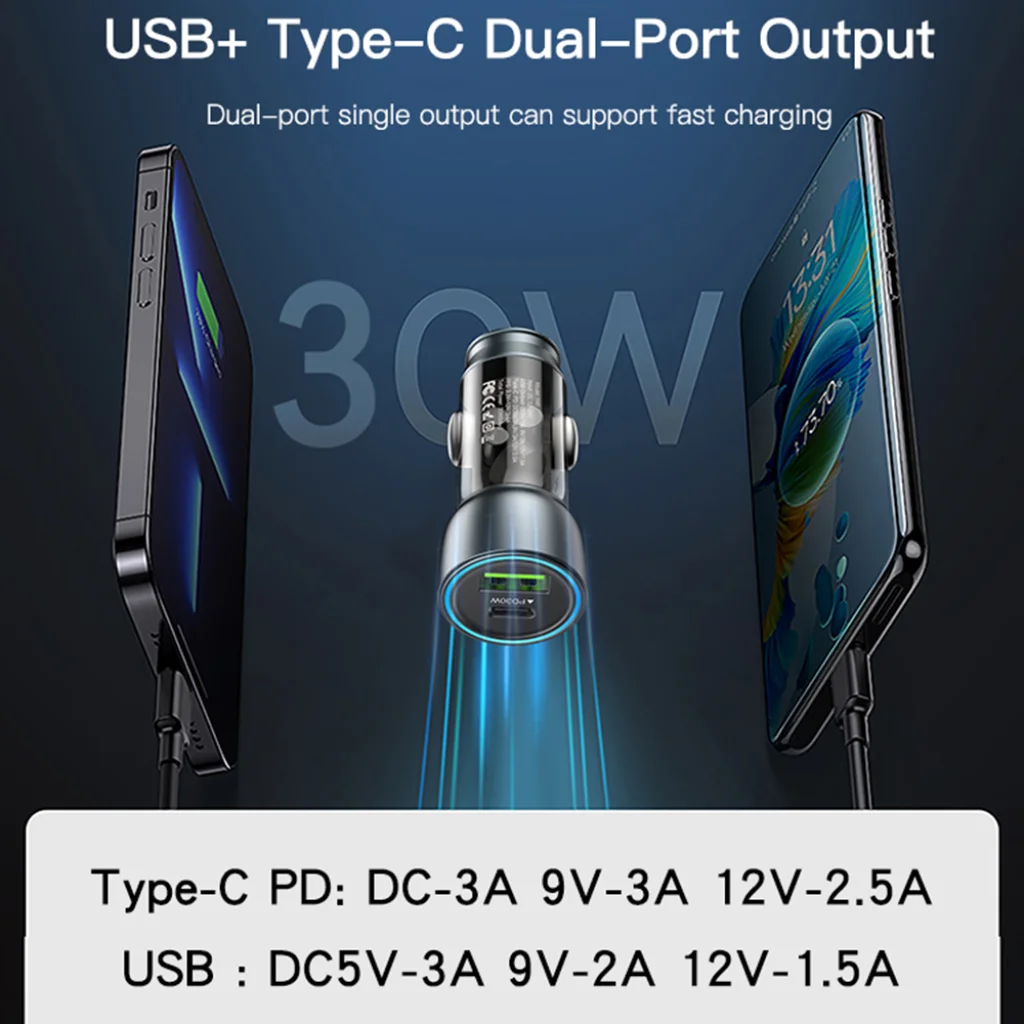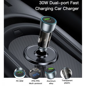 Ez a töltő nemcsak a teljesítményben jeleskedik, hanem a megjelenésében is. A felső rész elegáns alumínium ötvözetből készült, míg az alsó átlátszó PC+ABS műanyag feltárja a belső, precíziós áramköri lapot, modern és futurisztikus megjelenést kölcsönözve. A szürke és átlátszó barna színkombináció tökéletesen illeszkedik bármely autó belső terébe. A kék LED fényhatás nem csupán esztétikai elem; diszkréten megvilágítja a töltőportokat, megkönnyítve a használatát sötétben, és stílusos atmoszférát teremt az utastérben. Kompakt méretének (6.5 cm hosszúság) köszönhetően diszkréten illeszkedik a szivargyújtó aljzatba, nem zavarja a vezetőt.