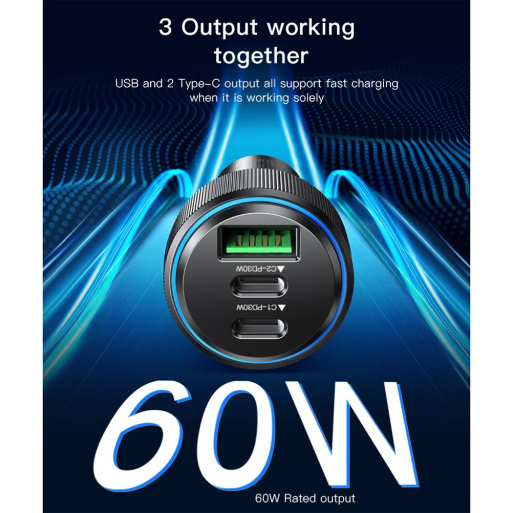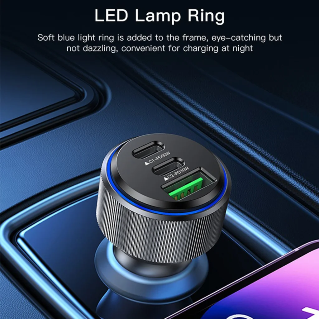 Yesido Autós töltő (Y50) - 2x Type-C, USB-A, Gyors töltés, 60W, LED lámpa gyűrű, Intelligens hőmérséklet-szabályozó chip - Fekete