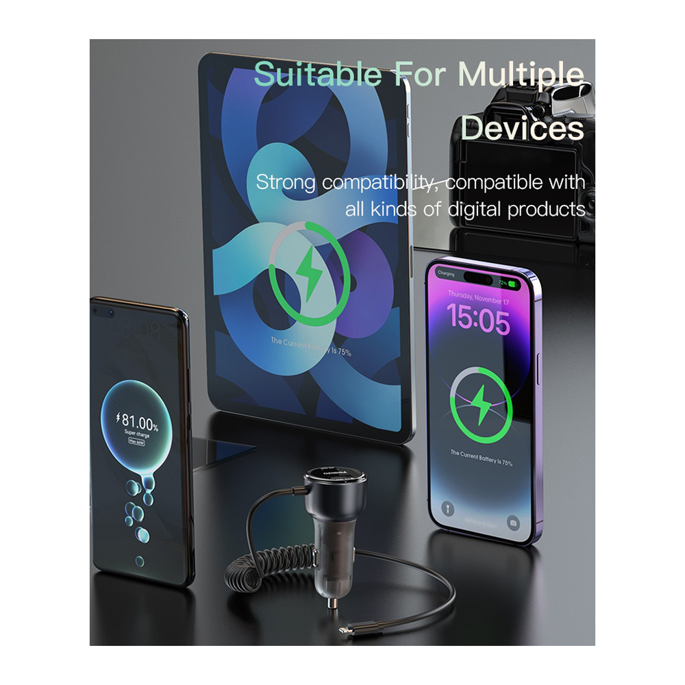 Yesido - Autós töltő (Y57) - Lightning rugós kábellel, Type-C/USB-A portokkal, 50W, Gyors töltés - Fekete