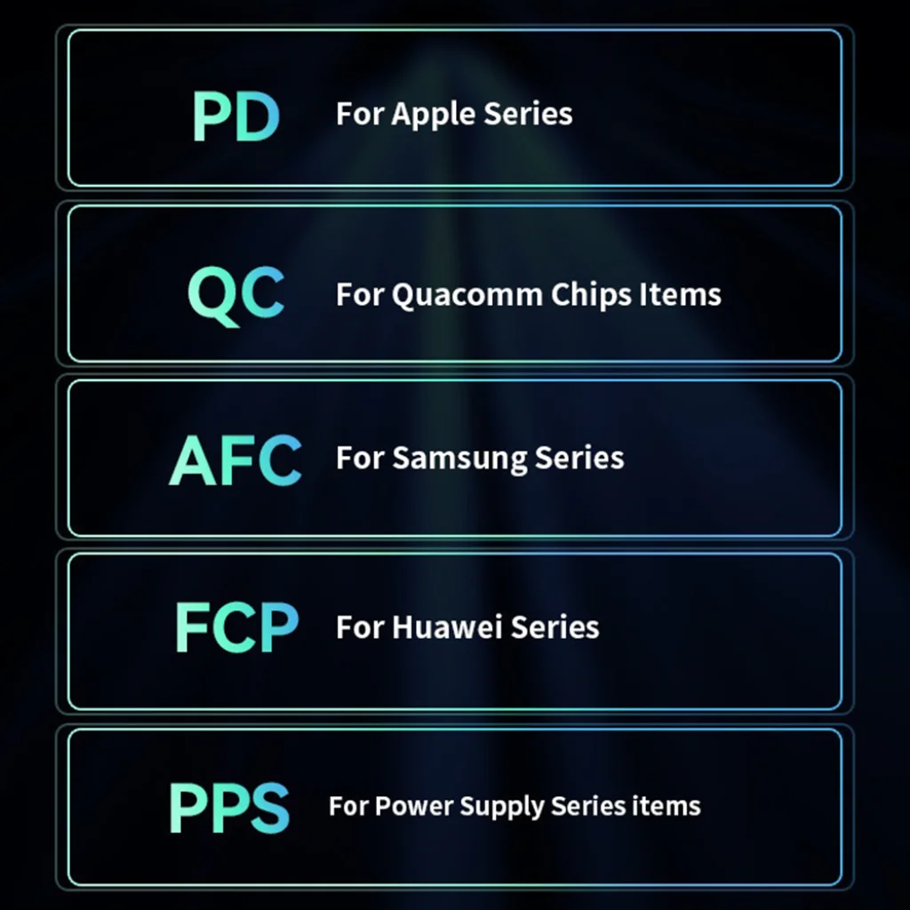 - Univerzális gyorstöltési protokollok támogatása: A töltő széles körű kompatibilitással rendelkezik, támogatva a legnépszerűbb gyorstöltési szabványokat, mint például a Power Delivery (PD) az Apple eszközökhöz, a Quick Charge (QC) a Qualcomm chipes készülékekhez, az Adaptive Fast Charging (AFC) a Samsunghoz, a Fast Charge Protocol (FCP) a Huawei-hez, és a Programmable Power Supply (PPS). Ez garantálja, hogy eszközei mindig a lehető leggyorsabban töltődjenek.
