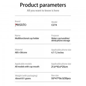 Tegye rendszerezetté és kényelmesebbé utazásait a Yesido Car Holder 4in1 (C274) multifunkcionális autós tartójával! Ez a forradalmi kiegészítő egyetlen elegáns megoldásban egyesíti a pohártartót, telefontartót, ételtálcát és apróságok tárolására szolgáló rekeszeket. Fekete színével és letisztult dizájnjával tökéletesen illeszkedik autója belső terébe, miközben maximális funkcionalitást nyújt.