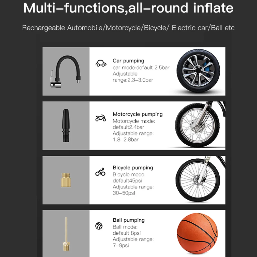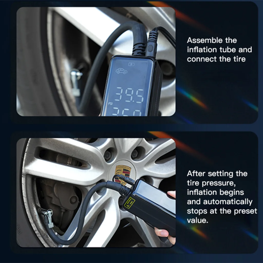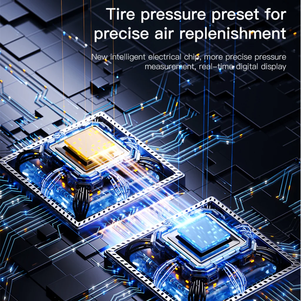 Az egyik legfontosabb fejlesztés az intelligens chip, amely precíz nyomásmérést tesz lehetővé, valós idejű digitális kijelzővel. Egyszerűen előre beállíthatja a kívánt gumiabroncs-nyomást, és a kompresszor egyetlen kattintással elkezdi a felfújást. Amint eléri a beállított értéket, automatikusan leáll, megakadályozva a túlfújást és kényelmes, erőfeszítés nélküli használatot biztosítva.