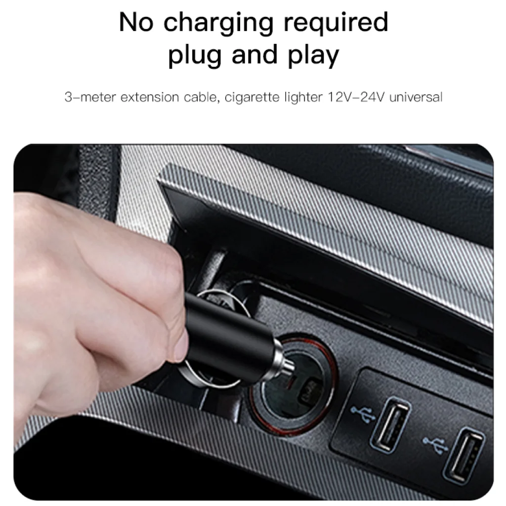 Nincs szükség akkumulátor töltésére, csak csatlakoztassa az eszközt az autó 12V-24V-os szivargyújtójába a mellékelt 3 méteres hosszabbító kábellel. A használat rendkívül egyszerű, mindössze négy lépésből áll: