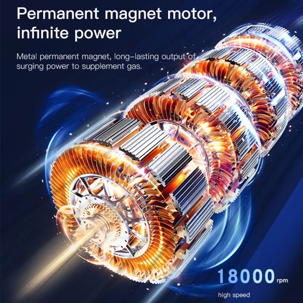 - Erőteljes motor: A beépített tartós mágneses motor 18000 fordulat/perc sebességgel dolgozik, garantálva a gyors és hatékony felfújást. A 50W-os (maximálisan 85W) teljesítmény biztosítja, hogy pillanatok alatt elérje a kívánt nyomást.