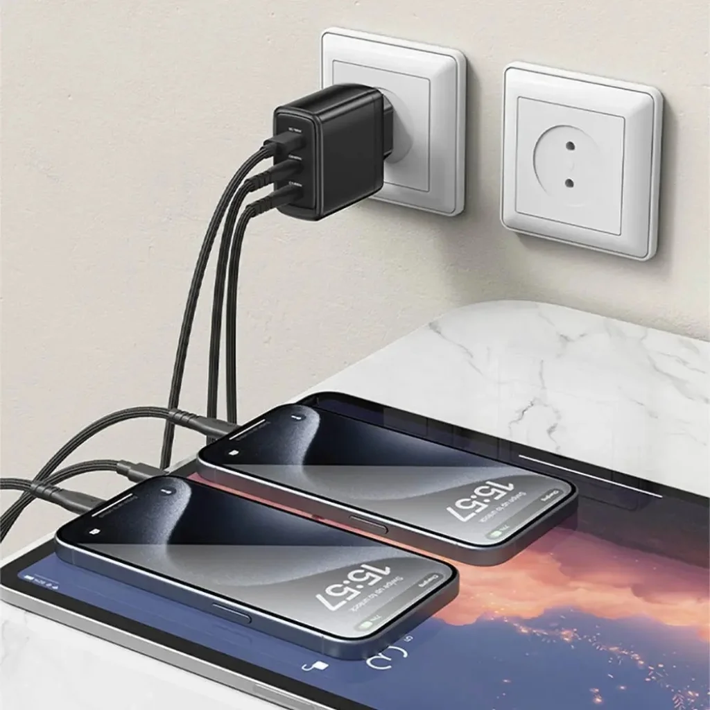 Ez a sokoldalú töltő három kimeneti porttal rendelkezik: két USB Type-C (PD65W) és egy USB-A (QC18W) porttal, amelyekkel egyszerre több eszközét is gyorsan feltöltheti. Ideális telefonok, tabletek, okosórák és akár laptopok (pl. MacBook) energiával való ellátására.