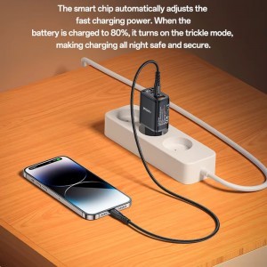 - Okos chip a biztonságos és kíméletes töltésért: A beépített intelligens chip automatikusan beállítja a szükséges töltési teljesítményt. Amikor az akkumulátor eléri a 80%-os töltöttséget, a töltő automatikusan csepptöltés módba kapcsol. Ez a funkció megóvja az akkumulátort a túltöltéstől, meghosszabbítja annak élettartamát és biztonságossá teszi az éjszakai töltést.