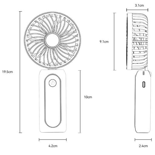 - Méretek (kinyitva): kb. 19.5 cm (magasság) x 9.1 cm (ventilátor átmérő)
