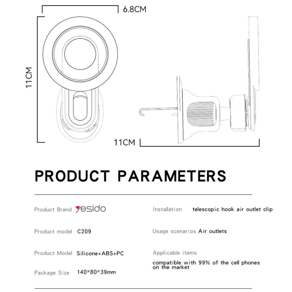 A teleszkópos kampós légbeömlő klipnek köszönhetően a Yesido C209 pillanatok alatt telepíthető a legtöbb autó légbeömlő rácsára. Univerzális kialakításának hála a 4,7 és 7,2 hüvelyk közötti eszközökkel, beleértve a MagSafe kompatibilis iPhone modelleket (például az iPhone 12, 13, 14 szériák), és a piacon lévő telefonok 99%-ával kompatibilis. Ezen felül nem takarja el a kilátást vezetés közben.
