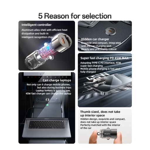 - Tökéletes integráció: Felejtsd el a nagy, kiálló töltőket! A Yesido Y67 olyan kicsi, mint egy hüvelykujj, és teljesen belesimul az autó szivargyújtó aljzatába, megőrizve az utastér rendezettségét.