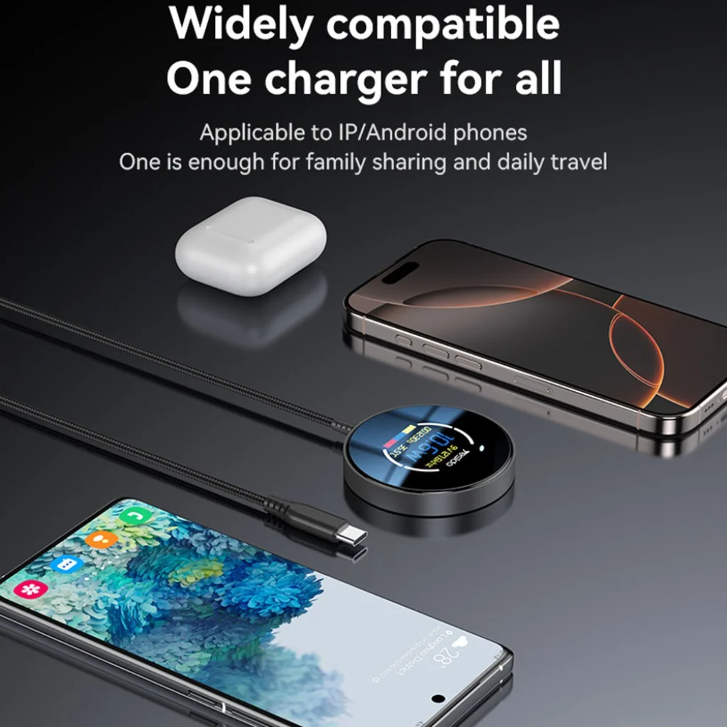 - Funkciók: Mágneses rögzítés, valós idejű LCD kijelző (feszültség, teljesítmény, hőmérséklet, töltési idő), intelligens hőmérséklet-szabályozás, QC és PD protokoll támogatás, FOD védelem, túlfeszültség, túláram, alacsony feszültség, túlmelegedés elleni védelem.