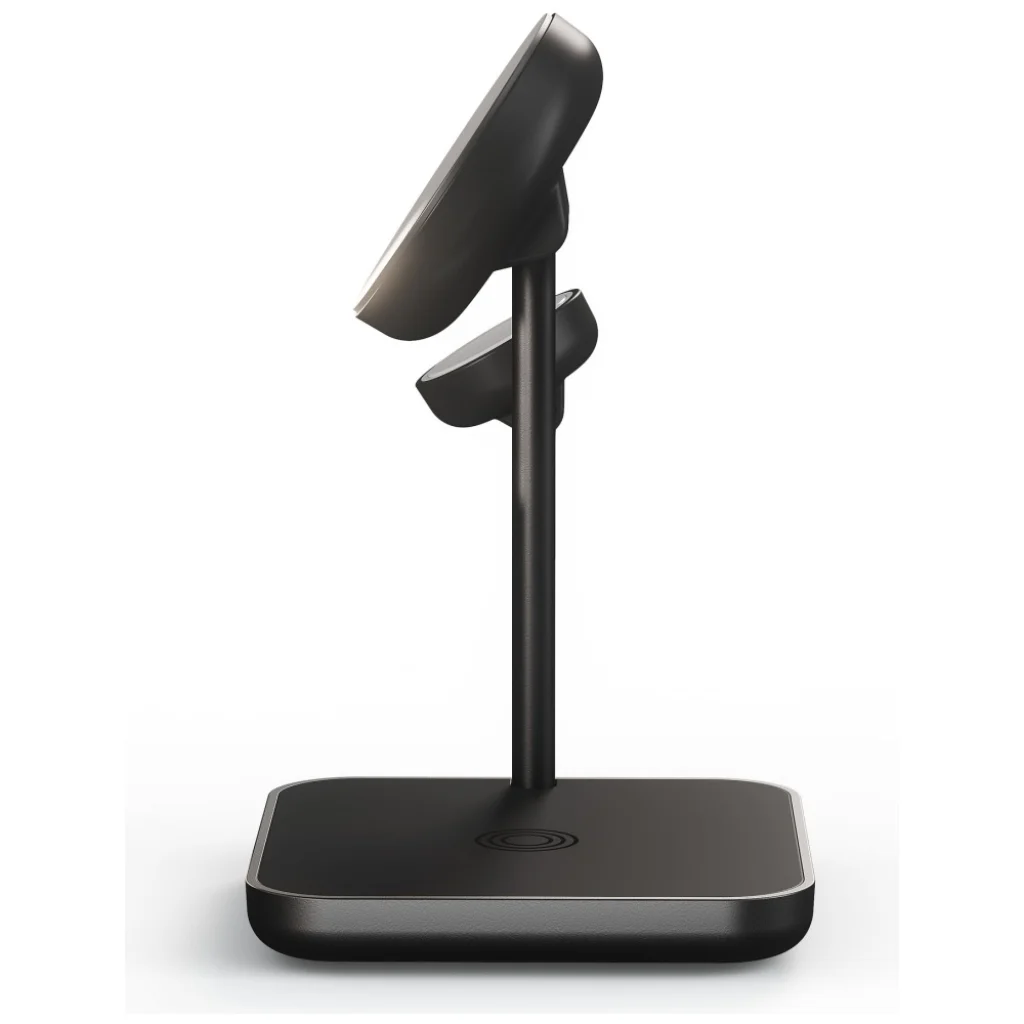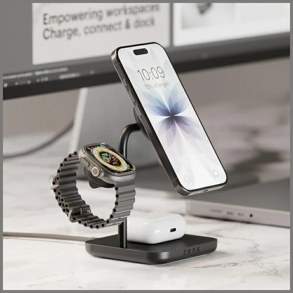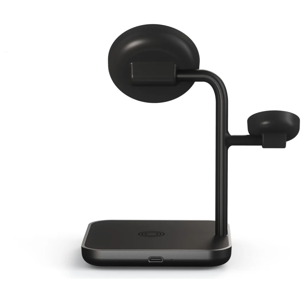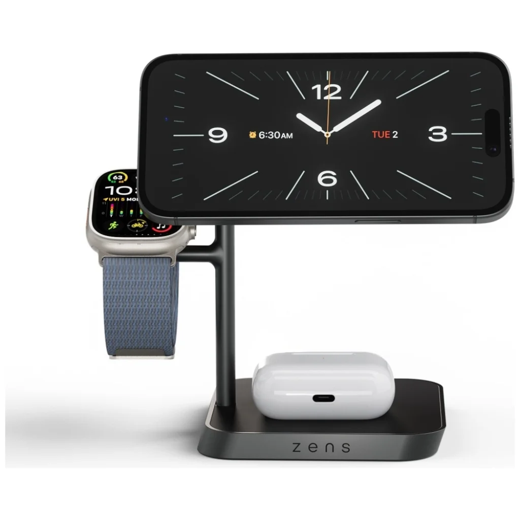 A Zens Office Charger Pro 3 mágneses 3 az 1-ben vezeték nélküli töltő egy fejlett megoldás a rendezett és modern munkakörnyezethez. Lehetővé teszi három eszköz egyidejű töltését – egy iPhone készülékét (12-es szériától és újabb modellek), Apple Watch órát, valamint AirPods fülhallgatót vagy más Qi2-kompatibilis eszközt. A Qi2 technológiának és a mágneses illesztésnek köszönhetően az okostelefon automatikusan optimális pozícióba kerül, így gyors és stabil, akár 15 W-os töltést biztosít. Ideális választás az Apple ökoszisztéma felhasználóinak, akik szeretnék csökkenteni a kábelek számát és rendezettebben tartani az íróasztalukat.